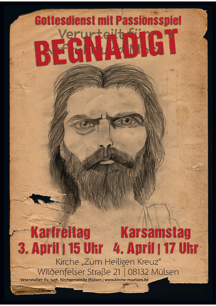 BEGNADIGT - unter diesem Titel steht das diesjährige Passionsspiel, das am Karfreitag, 3. April 2026 um 15:00 Uhr und am Karsamstag, 4. April 2026 um 17:00 Uhr in der Ortmannsdorfer Kirche, Wildenfelser Str. 21, stattfindet.