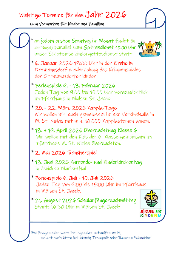 Jedes Kind, egal ob Kirchgemeindemitglied oder nicht, ist recht herzlich zur Christenlehre eingeladen. Die Christenlehre ist ein Freizeitangebot, das aber eine regelmäßige Teilnahme erwartet. In den Schulferien und an Feiertagen findet keine Christenlehre statt.