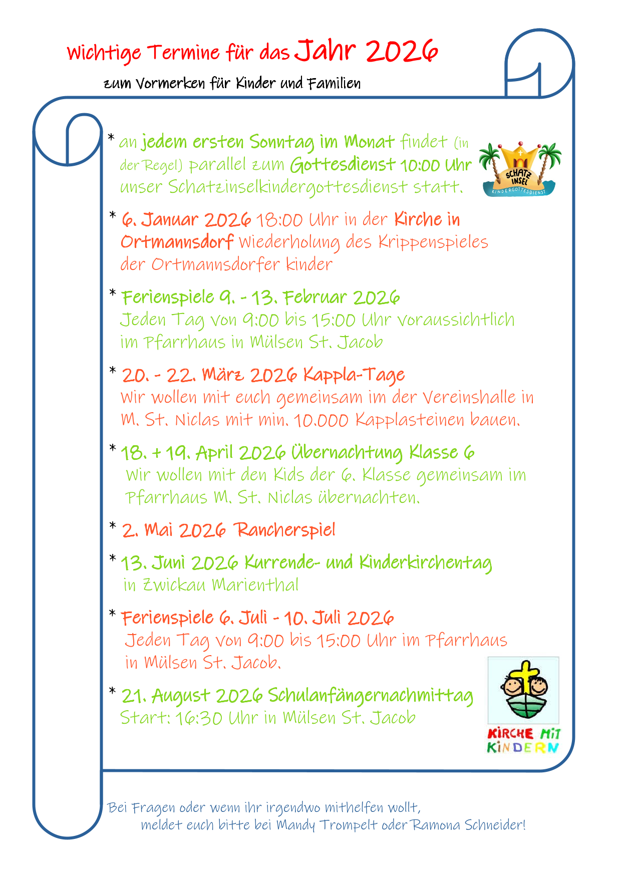 Falls die angebotenen Zeiten der Klasse Ihres Kindes nicht in dessen Wochenplan passt, ist es für Kinder ab der 5. Klasse auch möglich als Mitarbeiter/in in einer jüngeren Christenlehregruppe zu helfen. Sprechen Sie uns darauf an.
